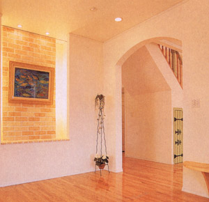 玄関は住宅の顔。やさしいカタチにすれば、心が和み、人の出入りも多くなります。また、玄関に入って最初に階段の上り口が見えれば、子供が帰ってすぐに2階へ閉じこもってしまうなど、目に入るものは、心に影響するので注意を。香りや光、形、素材など、住む人が気持ちよく感じ、元気と安心感を与えてくれる玄関をつくりましょう。そのほか、男性が世帯主ならば、表札の位置は外から向かって右側、女性なら左側に。こちらもヒノキ、イチイなど、生氣のある自然素材を使うと、氣の流れを整えてくれます。